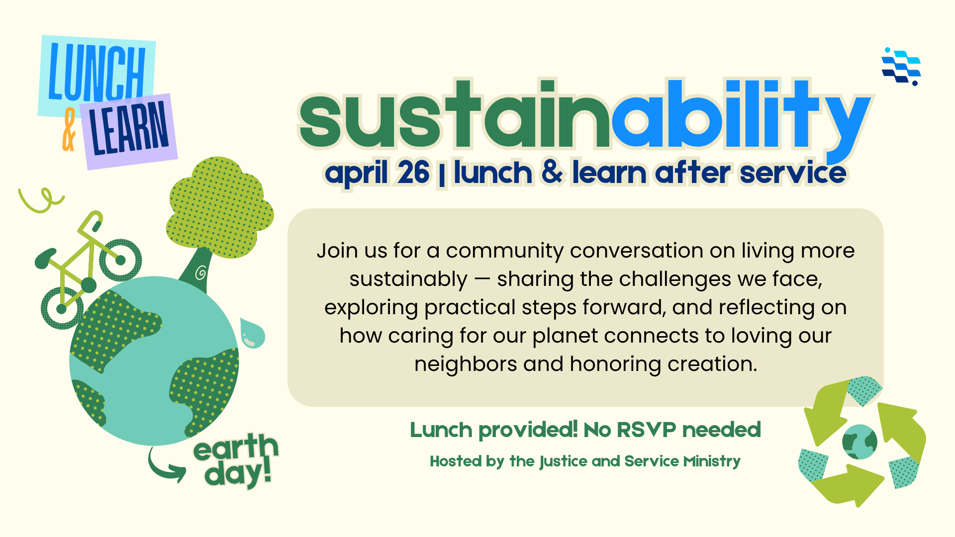 Back to All Events Lunch & Learn: Sustainability Sunday, April 26, 2026 12:00 PM 1:30 PM Google Calendar ICS Join us for a community conversation on living more sustainably — sharing the challenges we face, exploring practical steps forward, and reflecting on how caring for our planet connects to loving our neighbors and honoring creation. Lunch provided! No RSVP needed.